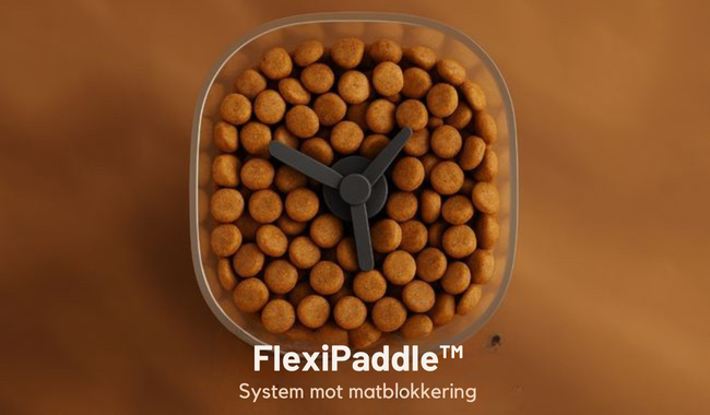 For å sikre jevn og problemfri dosering er Nutribot Connect utstyrt med FlexiPaddle™ -teknologi . Den fleksible, avtakbare padlen forhindrer at tørrfôret setter seg fast, selv for fôr i forskjellige former. Den er enkel å fjerne og rengjøre, og sikrer maksimal pålitelighet og total trygghet, slik at du unngår avbrudd i fôringen som kan stresse kjæledyret ditt.
