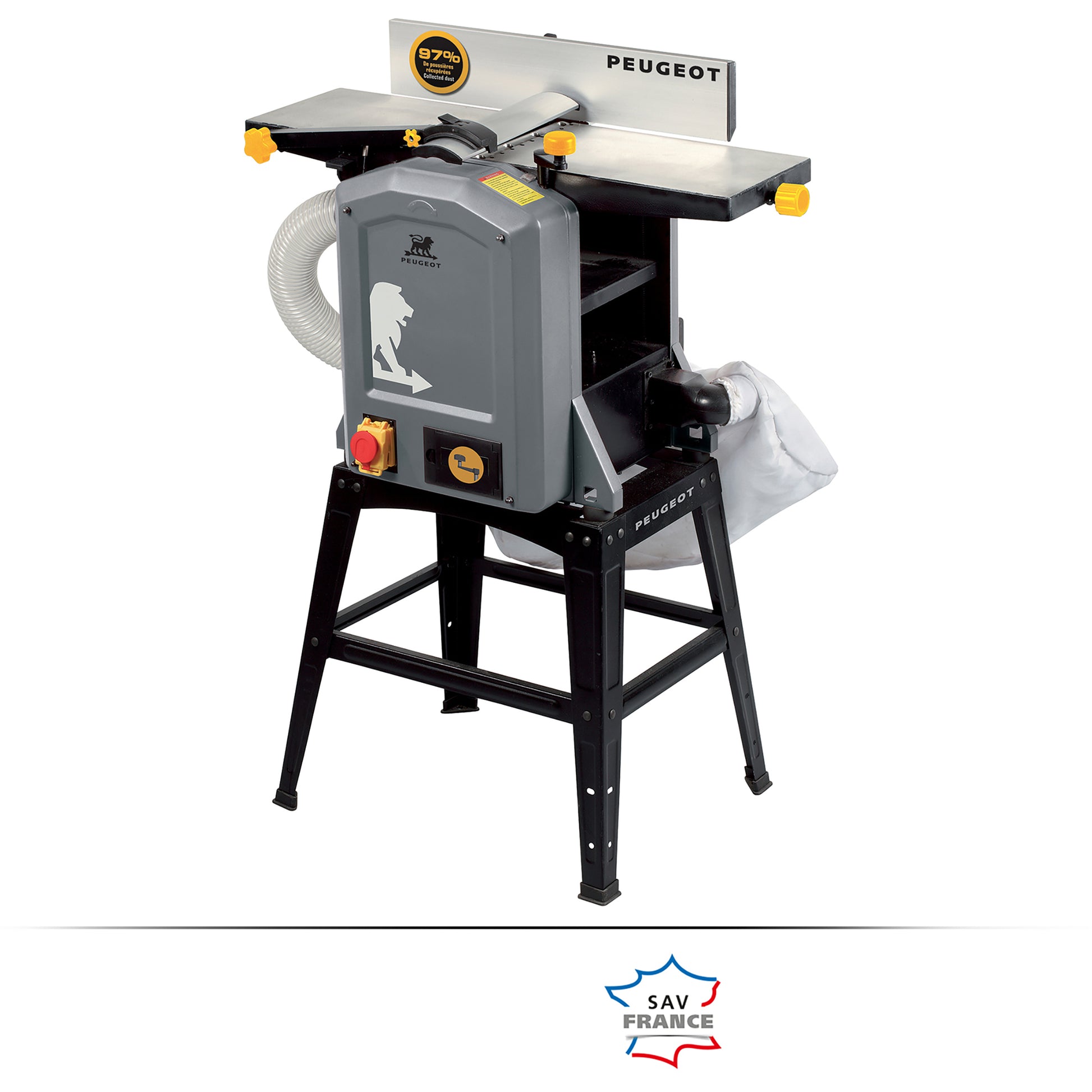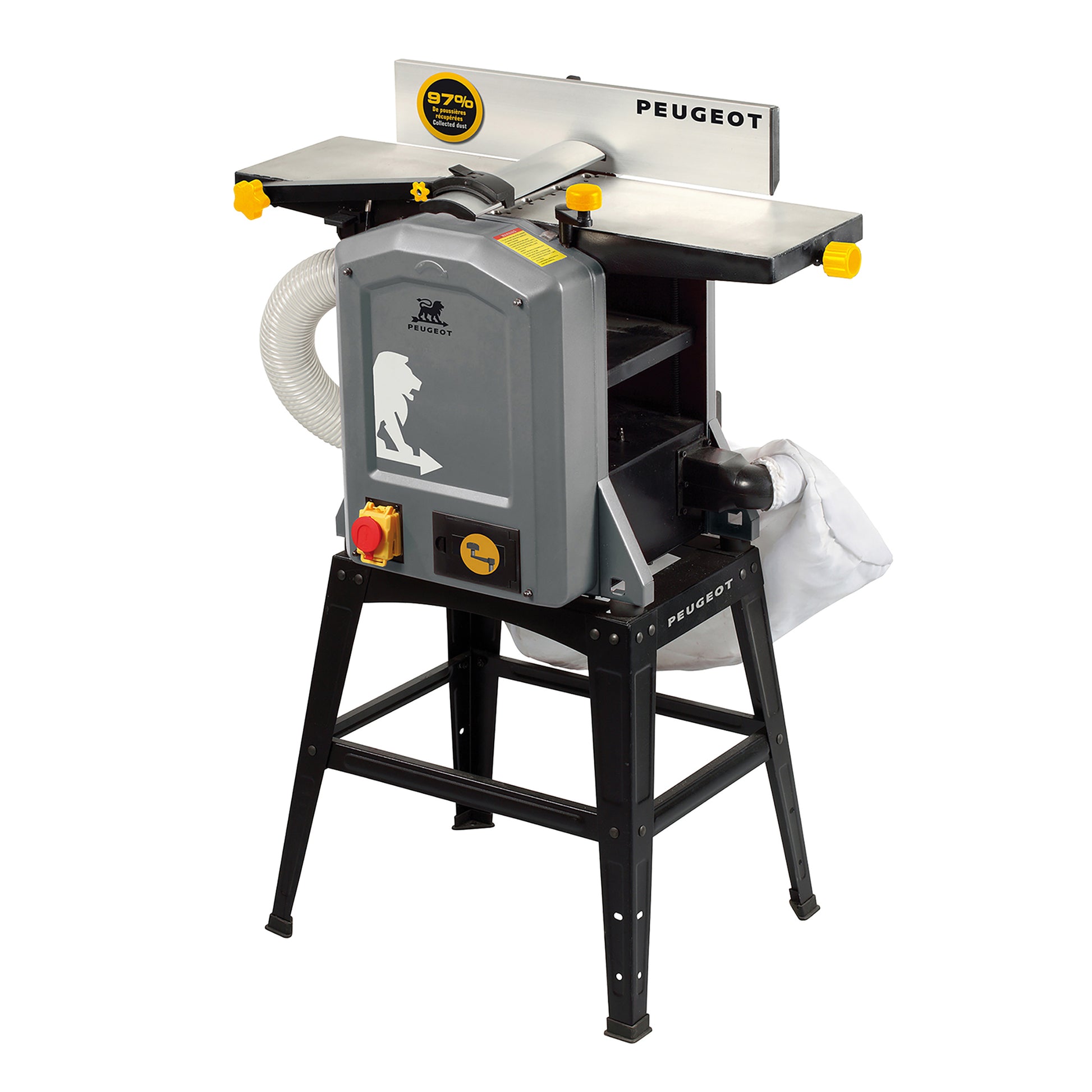 PEUGEOT legger stor vekt på brukersikkerhet. Tykkhøvelen er utstyrt med et bladbeskyttelse med innebygd sikkerhetsbryter, noe som minimerer risikoen under bruk. Den vippbare parallellføringen, justerbar fra 90 til 135°, muliggjør presise vinkelkutt. I tillegg gir en manuell termisk sikkerhetsbryter ekstra beskyttelse mot overbelastning av motoren.