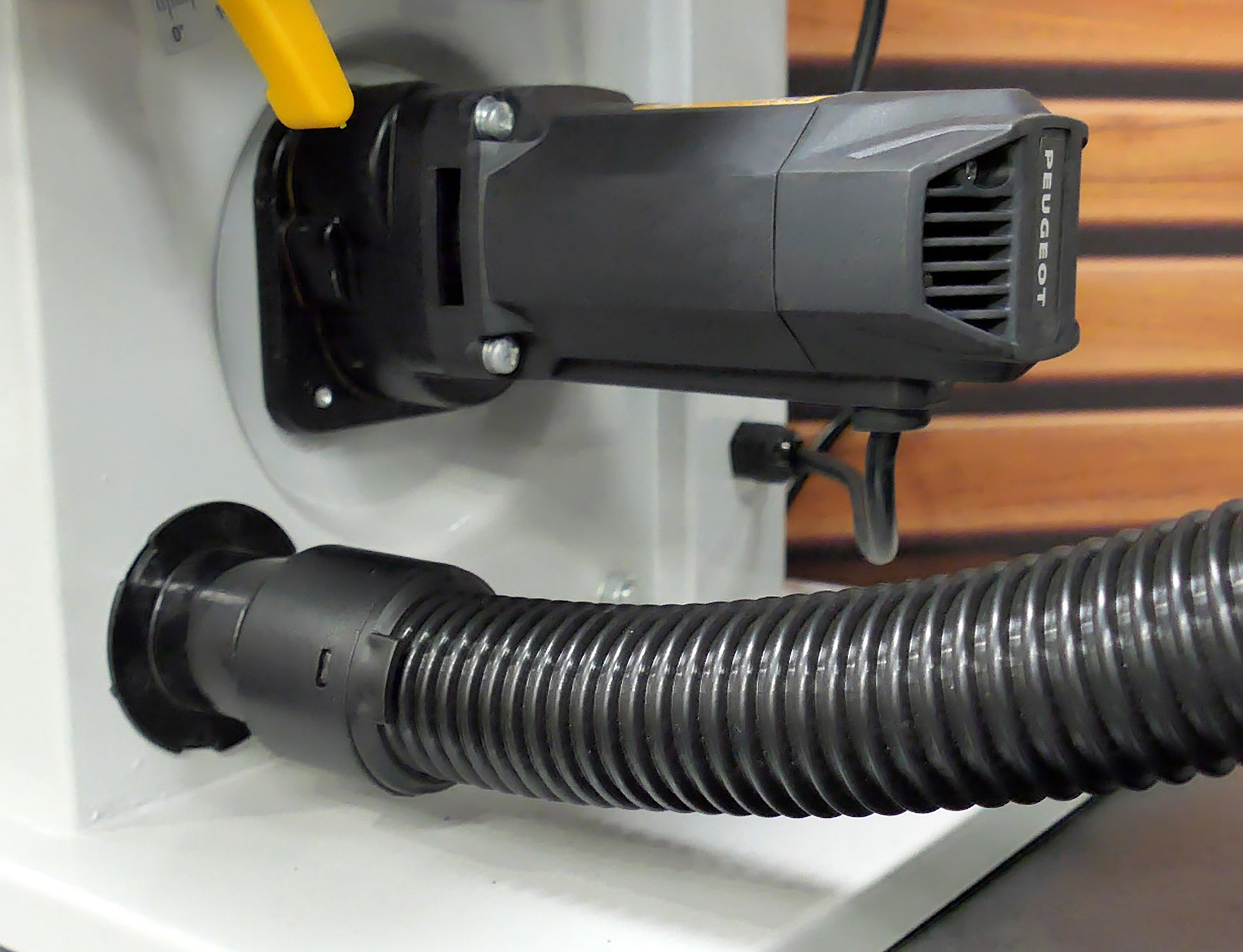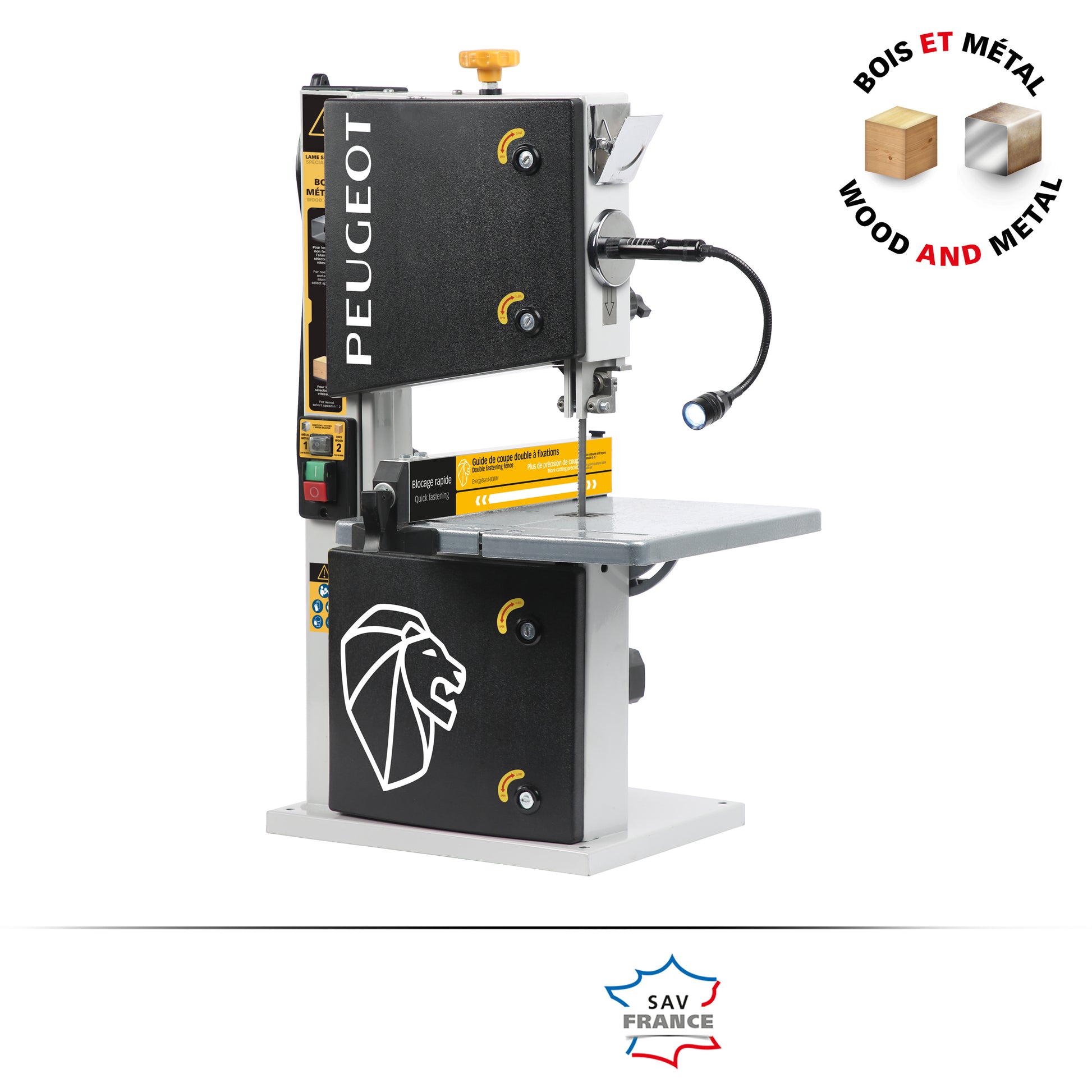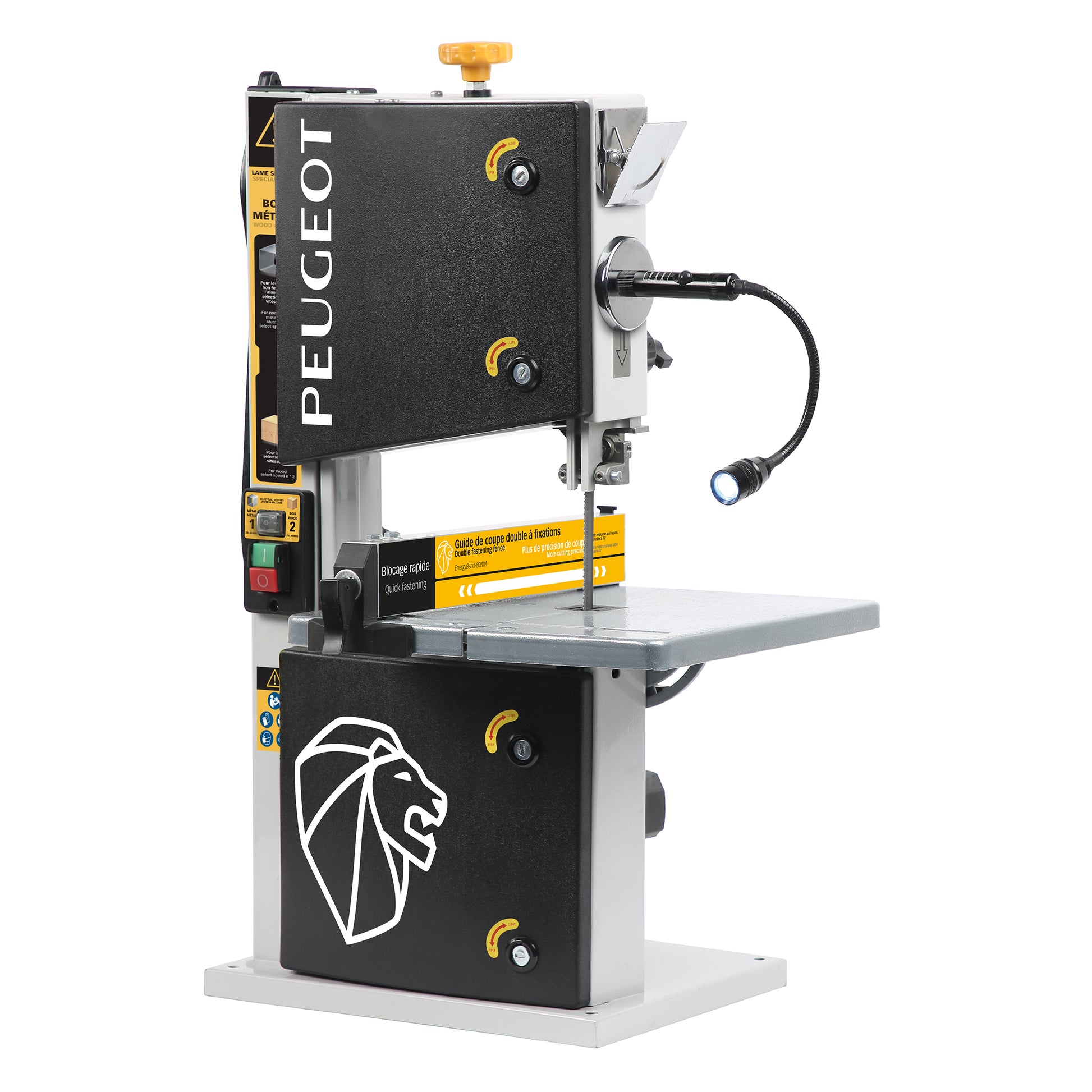PEUGEOT Tre- og Metallbenkbåndsag har et bord som kan vippes opptil 45°, noe som gjør den ideell for presise skråsnitt. Den øvre tannstangføringen og den nedre bladføringen sørger for at bladet holdes sikkert under saging, noe som sikrer rette og jevne kutt. For et sunnere arbeidsmiljø er det integrert en støvavsugsdyse, noe som gjør det enkelt å koble til et avsugssystem.