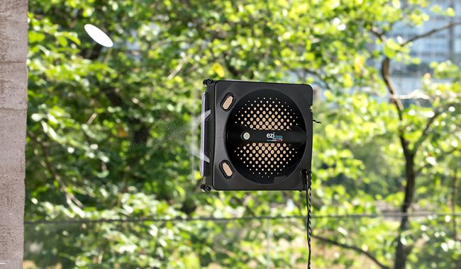 Den første Robot-vindusvaskeren, montert i Frankrike, som aktivt rengjør vinduer takket være sitt gnidende mikrofibersystem.